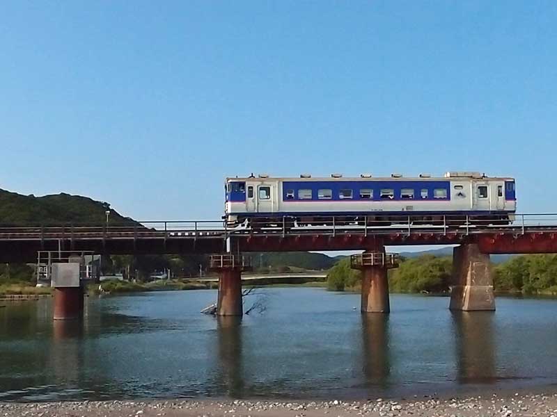 新冠川を渡る鉄橋を走り抜ける日高本線の車両を撮影しました。