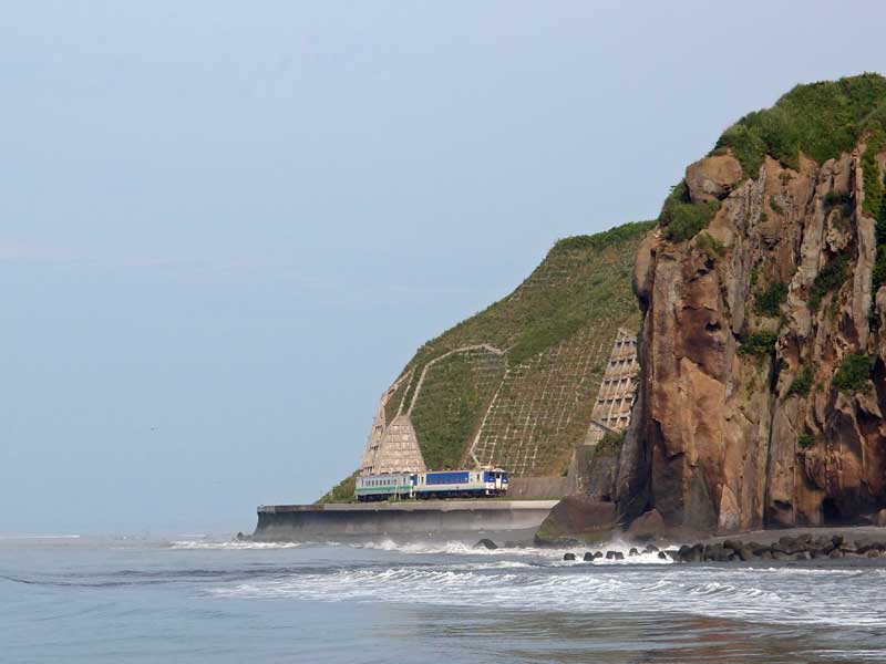 昨日と同じ新冠川河口に来たのは判官館の所のトンネル直前の海ギリギリを走る列車を撮影するために来ました。海が荒れると海水が列車にかかるような距離です。
