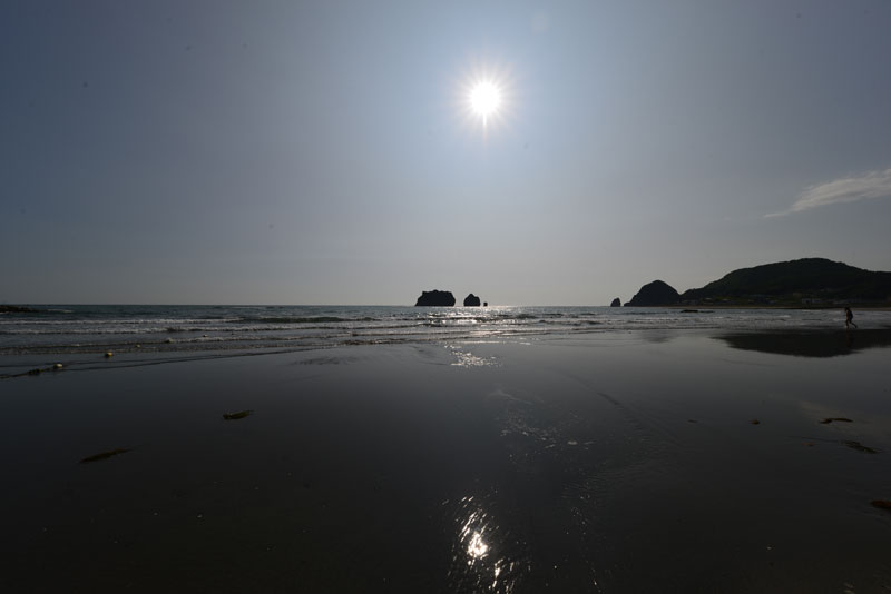 広角で撮影し右側の方を入れてみました。 右手の岬の先にはローソク岩が見えています。 太陽が低くなってきていてさらに沈んできたときに砂浜の位置を変えると親子岩のあたりになりそうです。