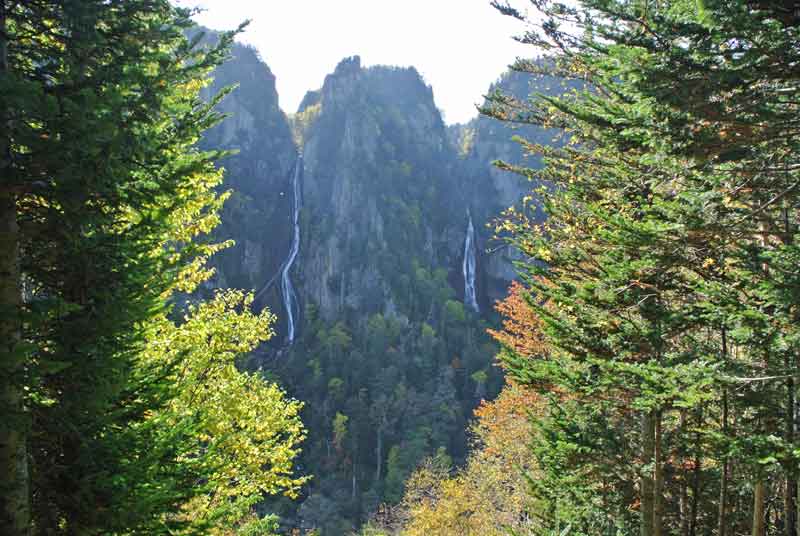 石狩川沿いの散策路から流星の滝と銀河の滝は見られますが両方一遍には見られません。 国道の反対側を140mほど登ると両方の滝が一緒に見られる双瀑台があり、そこから撮影しました。 左が銀河の滝で右が流星の滝です。