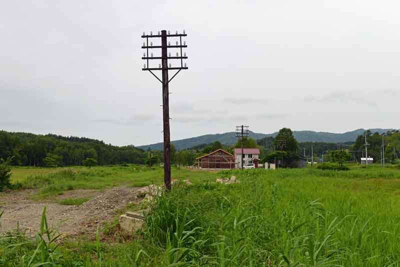 深名線の廃線跡は大きなものから小さなものまでたくさんあります。小さなものの代表はこの通称「ハエタタキ」と言われている通信用の電柱でしょう。 簡単に撤去できるはずですが向こうにも一本見えます。