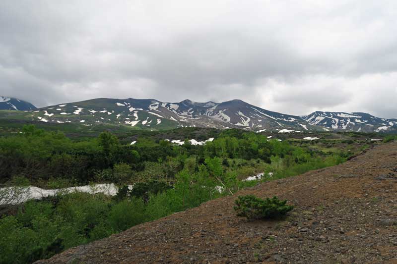 十勝岳展望所には無料の駐車場があり、そこに車をおいて少し登った所から撮影した写真です。 この写真の右手にはずっと道があり、それは十勝岳への登山道になっています。5月は雪解けが進んでいて道路には雪がありませんが、道の横やあちこちにまだ雪が残っています。