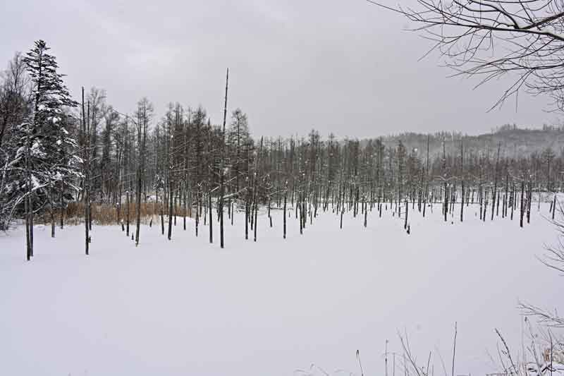 青い池は夏なら湖面も見えて観光地レベルですが、ここまで積もっていてはただの雪原です。