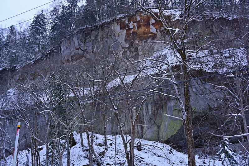 同じような柱状節理の一角に雪がついていて変わった岩がありました。