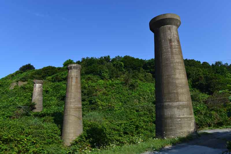 この場所には橋梁の柱が残っています。 この上に鉄橋が乗せられるのでしょうが未成線なので柱だけ作って終わってしまったのかも知れません。