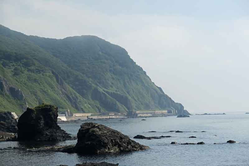 この辺りの遠くには竜飛崎などが見えるはずですが、夏は視界が悪くはっきりとはわかりませんでした。 水平線の所にかすかに陸地のように見えるのがそうかも知れません。