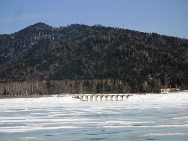 しばらく歩くと遠くに目指すタウシュベツ橋が見えてきました。 しかしまっすぐ行くのは危険な場所なので右手に大回りします。