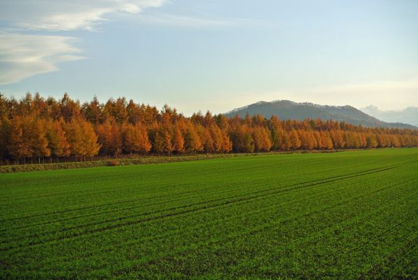 夕方の防風林は木入りに色づいていたのが夕焼けに照らされてオレンジ色に変わります。