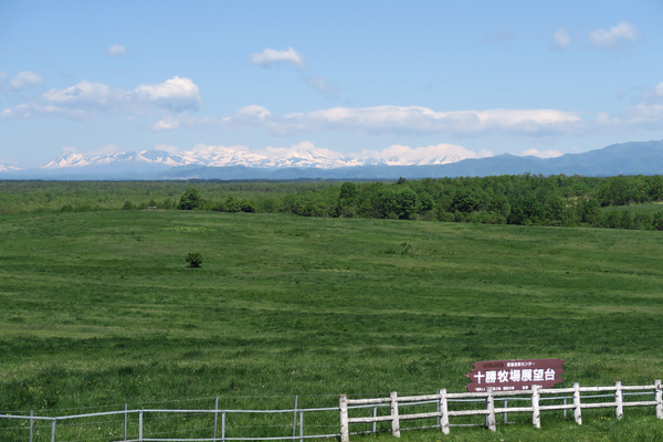 十勝牧場の一般公開されている最奥部の展望台からの眺めで遠くの山に積もった雪と青空と牧場の緑の色の違いがとてもきれいですね。