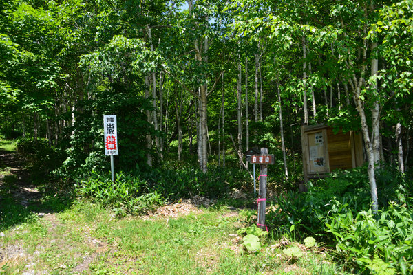 通行止めの柵の左側は登山道の入り口になっていて、白雲山という案内板があり登山届を入れるポストもありました。 熊出没注意の立て看板がちょっと怖いですね。