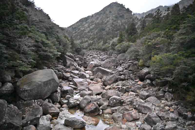橋の上で上流側を撮影したもので大きな岩がゴロゴロしている川です。