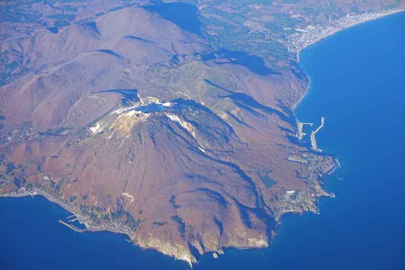 冬の始まり頃の新千歳空港に向かう便からの恵山の風景で、恵山の山頂にだけ雪が積もっています。