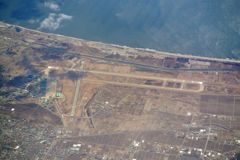 海岸線の近くに航空自衛隊の松島基地の滑走路が見えてきました。 滑走路と海岸線の間に見える溝は北上運河です。