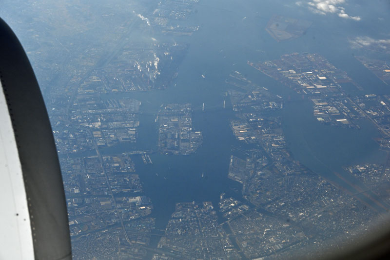西に向かう便で名古屋の上空を飛行中に名古屋港が見えて来ました