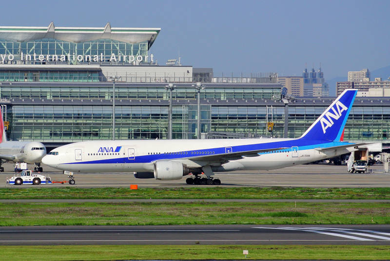 ANAのトリプルセブンが国際線ターミナル前を牽引されていきます。牽引車もブルーのラインが入ってANAのようですね。