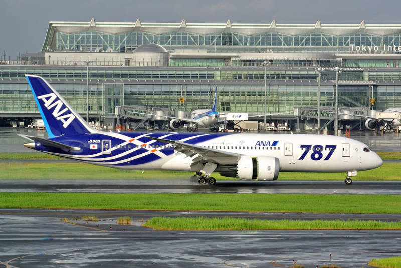 ANAの787の着陸シーンです。 787はANAがローンチカスタマーでその初号機のJA801Aは世界で初めて航空会社に登録されて運行されたもので、ANAも特別塗装で運行しています。