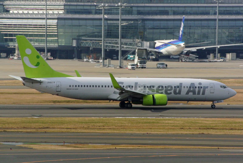 ソラシドエアーの737の着陸シーンです。 エンジンの緑の部分がぱっくりわれて豆が出てくるようですね。