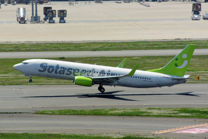 ソラシド・エアーの普通の塗装の離陸シーンです。 ちょうど地上から離れたところです。