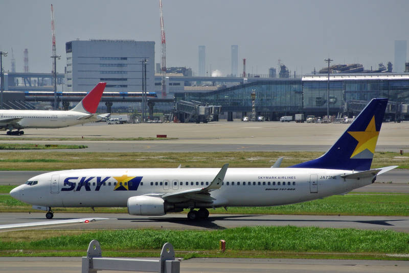 スカイマークのウィングレットに音符の付いた機材が移動していきます。