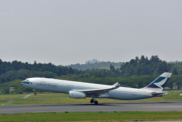 キャセイパシフィック航空のエアバスA330で-300型なので胴体が長くてスマートですね。 CX501便として香港に向けて飛び立っていきました。