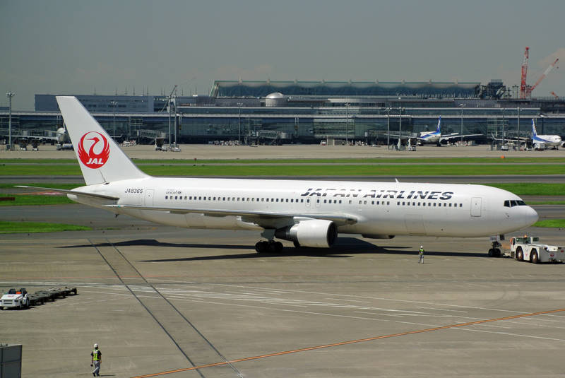 新塗装になったJALの767がスポットからプッシュバックされているところです。