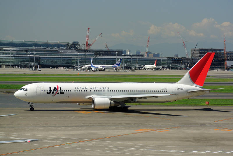 旧塗装(太陽のアーク)のままの767がエプロン前の誘導路を移動していきました。