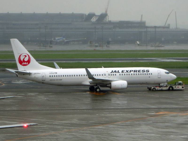 エプロン前の誘導路を牽引されて移動していくJAL Expressの機材です。