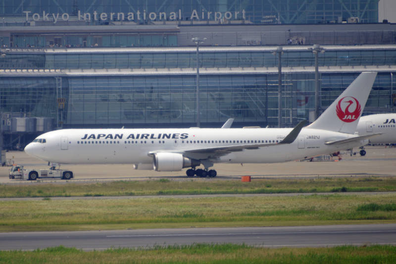 国際線ターミナル前を牽引されて移動していくJALの767新塗装です。