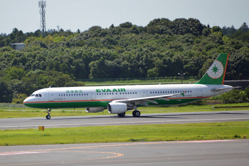 エバ航空はキティちゃんジェットが多いですが、これは通常塗装で成田空港を離陸していきました。