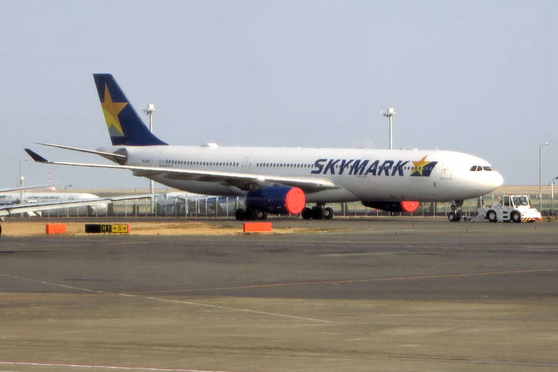 スカイマークが737以外で導入して拡大しようとしていた時の機材です。この時から経営が怪しくなり結局はこの機は売却になってしまいます。 この時も運行の為でない移動でエンジンにカバーがかけられています。737の場合はSKYしか書かれていませんがA330は機体が大きいのでフルネームで書かれていますね。