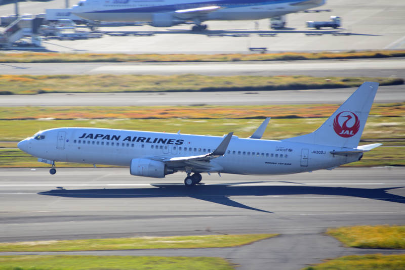 A滑走路から離陸していくJALの737で前輪が浮いていますね。