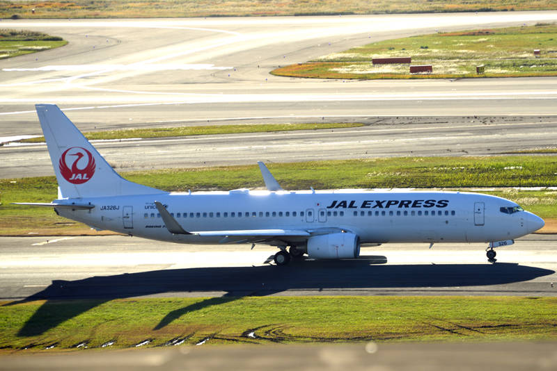 誘導路を北に向かって移動していくJALの737で離陸なのかスポットに行くのかは不明です。