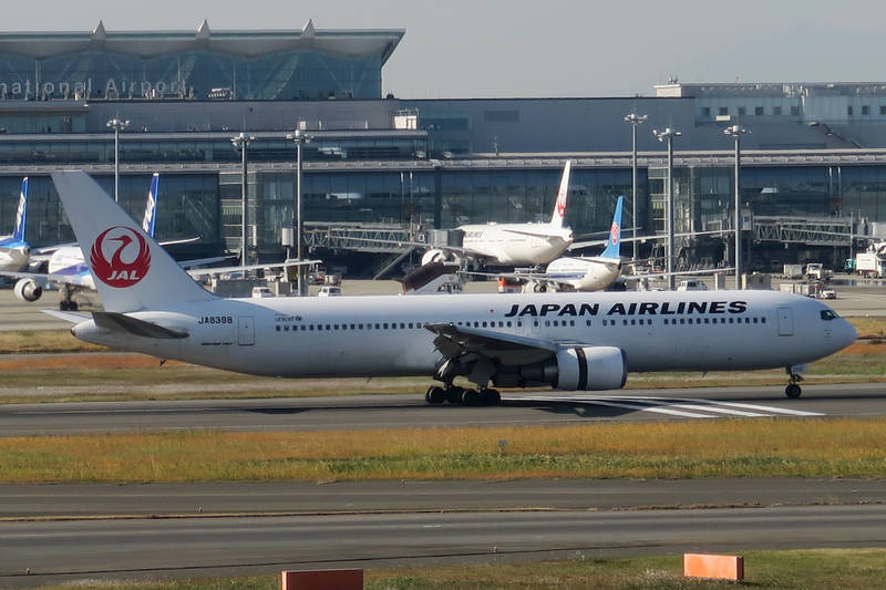 JALの767が羽田空港のA滑走路に着陸して逆噴射をしています。