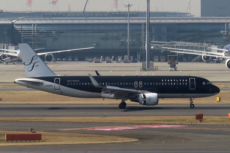 羽田空港のA滑走路にちゃくりくして逆噴射中のスターフライヤーです。