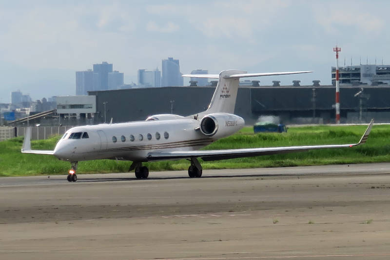 D滑走路に向けて誘導路を進んでいるときにアメリカの会社所有の機材が近くを進んでいました。