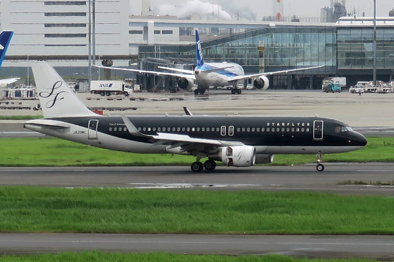 スターフライヤーの機材が羽田のA滑走路に着陸して逆噴射中です。逆噴射中のカバーの開きかたが面白いですね。