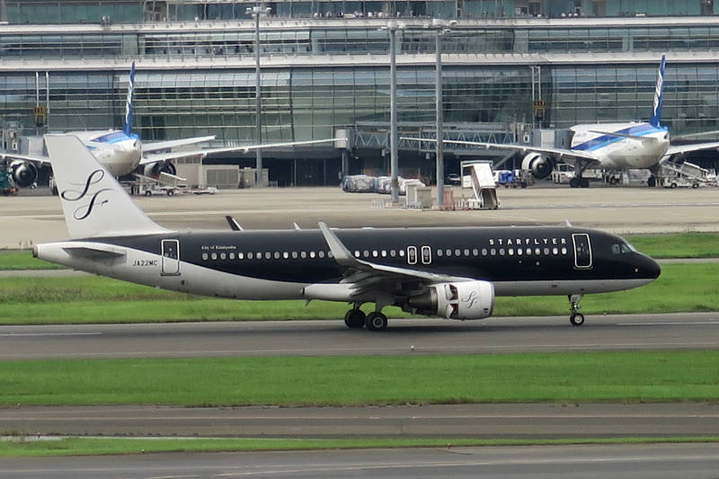 スターフライヤーのエアバス機が着陸してきました。 逆噴射のエンジンカバーの空き方が面白いですね。