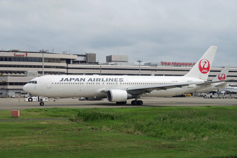 搭乗機から離陸の滑走路に向かう誘導路から出発準備中の767を撮影しました。