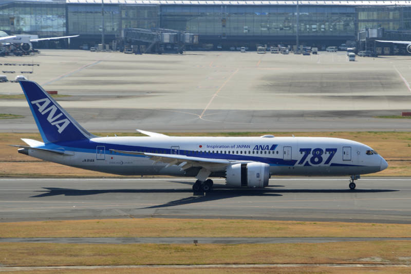 ANAの787の特別塗装機が羽田空港のA滑走路に着陸して逆噴射をしています。