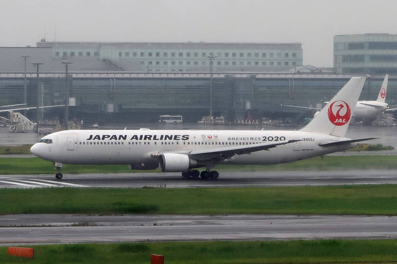 雨の羽田空港のA滑走路から東京オリンピック応援ロゴの入っている767が離陸していきました。