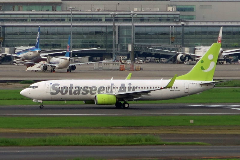 ソラシドエアーの737が羽田空港のA滑走路から離陸するために加速中です