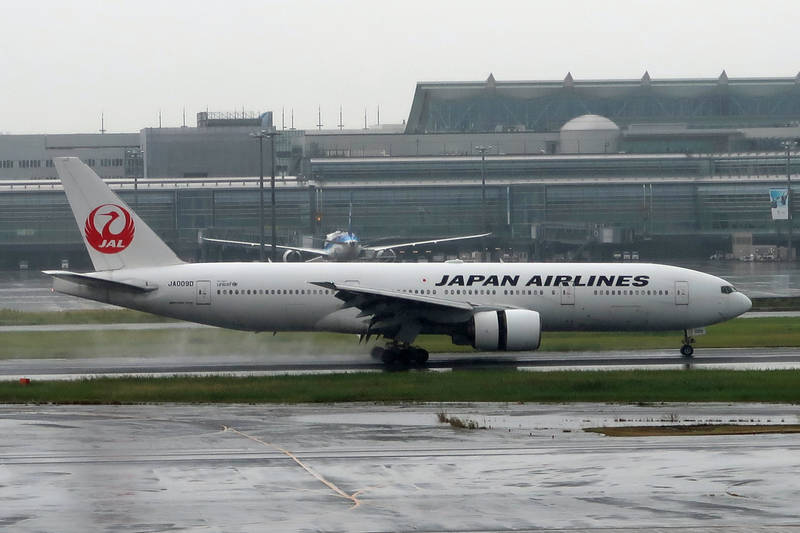 羽田空港のA滑走路に着陸して逆噴射をしているJALのトリプルセブンです。 水煙があまり上がっていませんね。