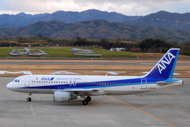 高松空港で撮影したANAのエアバス機で空港の特徴となる「さぬき」の文字の後ろだけ写っています。