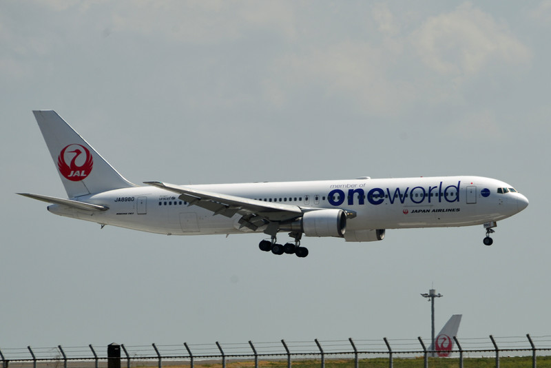 JALのアライアンスのワンワールド特別塗装機の767が羽田空港のB滑走路に着陸していきます。