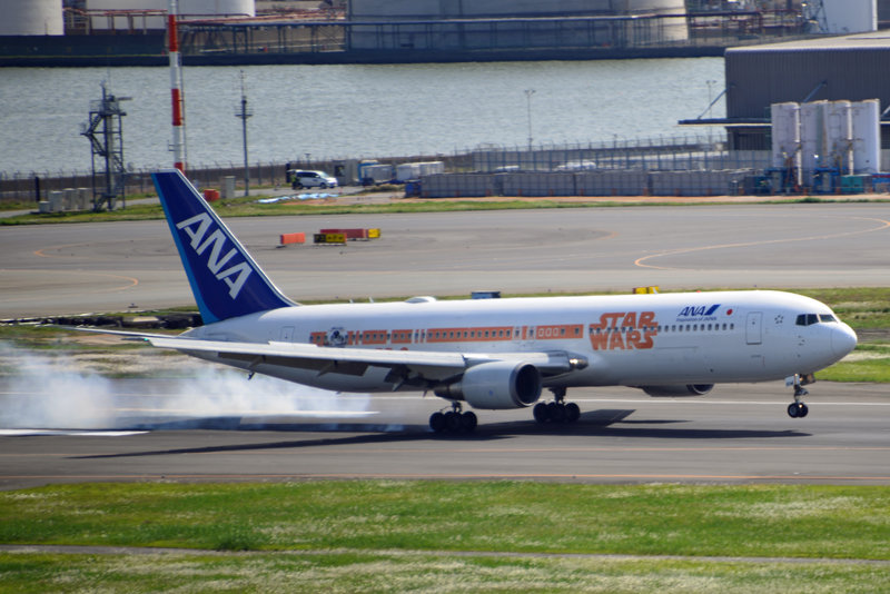 羽田空港のA滑走路に着陸するANAのスターウォーズジェットで派手にスモークが上がっています。