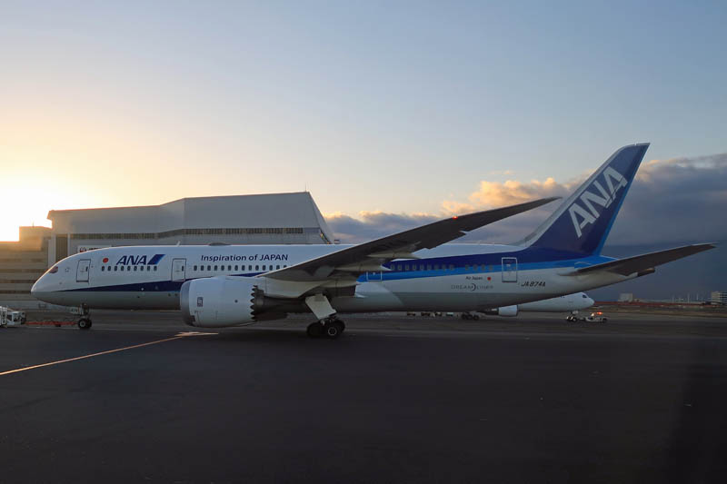 JAL機に乗って離陸のために誘導路をタクシング中に横にANAの787が牽引されて行くのを撮影しました。
