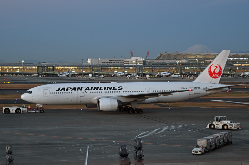 早朝の羽田空港でエプロン前を牽引されていくトリプルセブンです。冬なので見通しが良く尾翼の手前に同じような角度の富士山が見えます。