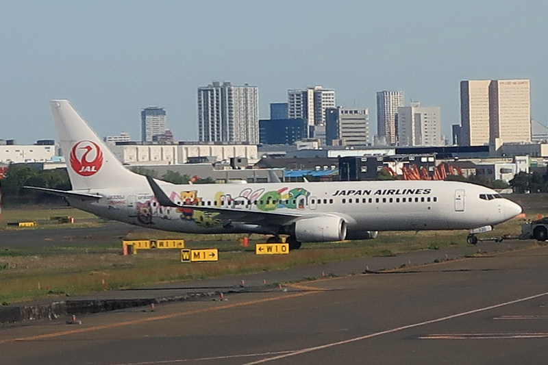 ベネッセの「こどもちゃれんじ」の特別塗装のしおまじろうジェットです。誘導路を移動中に牽引されていく機材の近くを通過したので撮影しました。