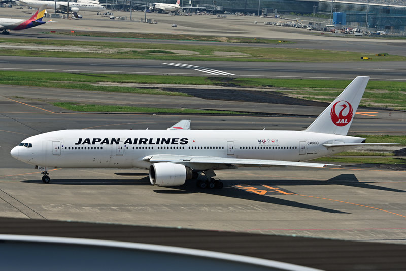 日本航空のトリプルセブンの特別塗装機です。 あまり目立たないような感じですが東京オリンピックのマスコットが小さく書かれています。