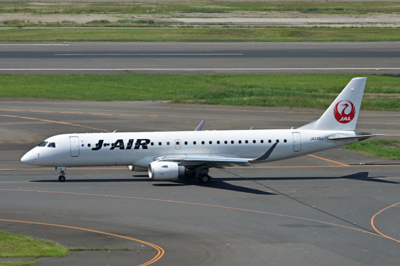 JALグループのJ-AIRのエンブラエルが離陸するために滑走路に向けて誘導路を進んでいきました。。